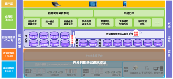 我项目组采用云计算、大数据的现代信息技术作为电子检务工程软件应用建设的总体架构。顺利获得建设的数据共享交换系统和数据服务总线管理系统搭建数据服务层(DaaS层),对检察院所有业务数据进行数据整合,横向打通检察院所有业务科室之间的数据壁垒,将检察院业务数据标准化,和最高检的统一业务系统实现无缝对接,并按照权限给予数据服务,为大数据分析和应用给予了坚实的基础。